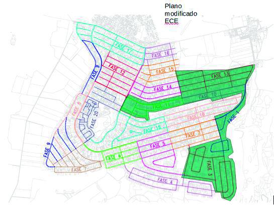 Las zonas coloreadas en verde son las que ya tienen suministro por las tuberías de las nuevas canalizaciones que discurren por las calles. Se estima que en los próximos meses se finalizará la fase 12 y durante el primer semestre de 2020 comenzarían los trabajos de las fases 14, 15, 16, 17 y 20.